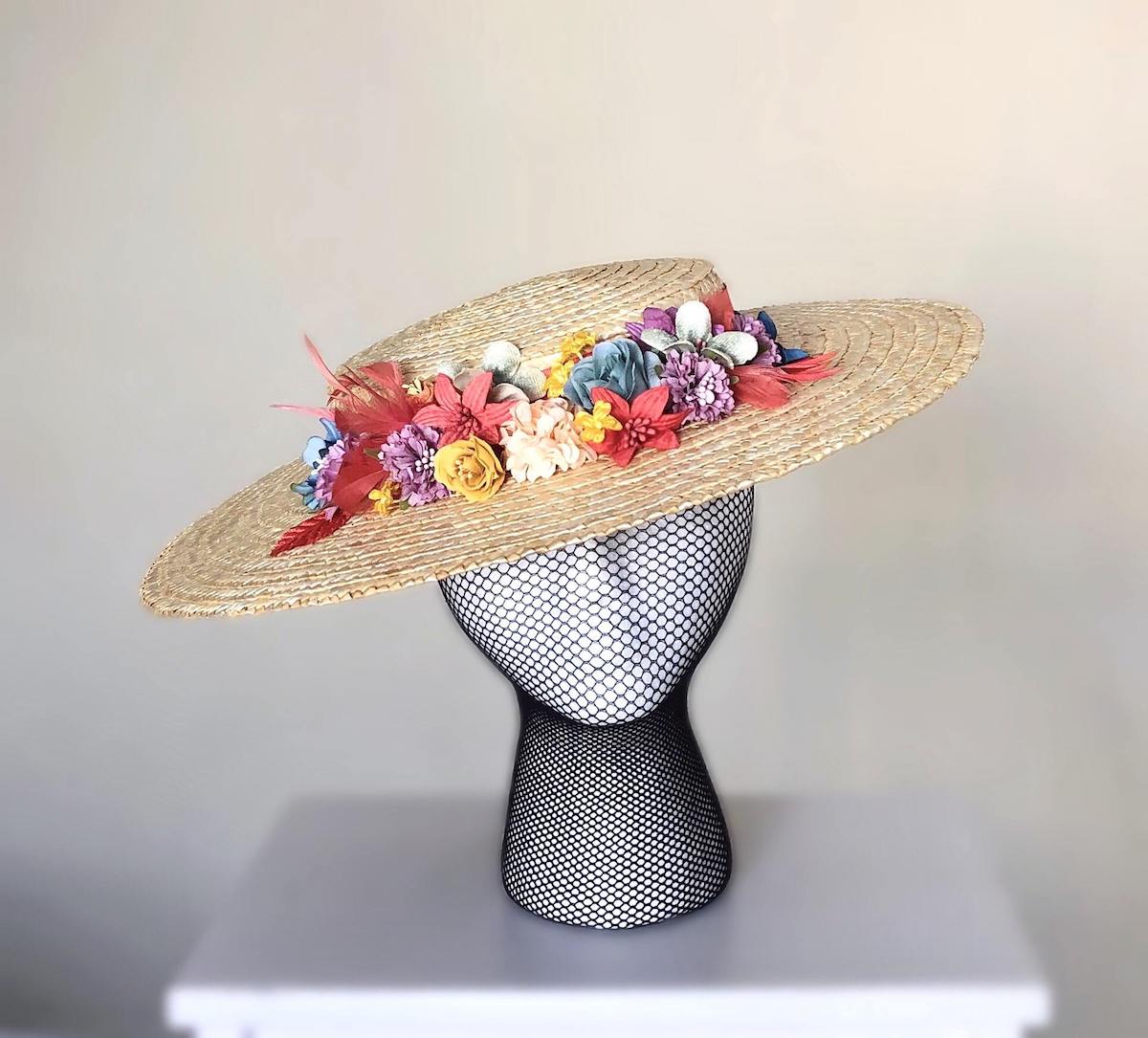 El Tocado valentina es un Tocado con base de paja natural decorada con una combinación de flores y petalos de tela en tonos naranja, amarillo, malva, azul y beige.